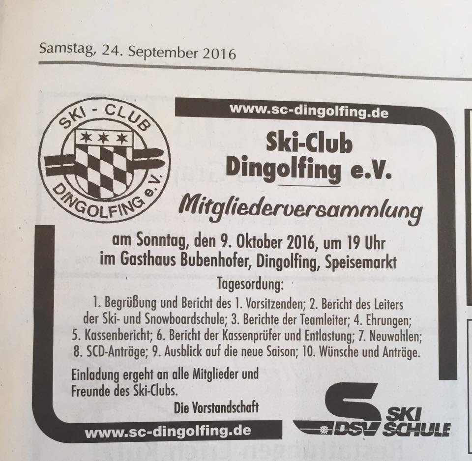 Am Sonntag den 9. Oktober 2016 findet ab 19 Uhr die Mitgliederversammlung im Gasthaus Bubenhofer, Dingolfing, Speisemarkt statt