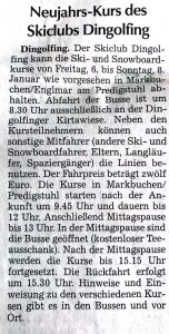 Der Skiclub Dingolfing kann die Ski- und Snowboardkurse von Freitag, den 6. bis Sonntag, den 8.Januar wie vorgesehen in Markbuchen / Englmar am Predigstuhl abhalten. Abfahrt der Busse ist um 8.30 Uhr ausschließlich an der Dingolfinger Kirtawiese. Neben den Kursteilnehmern können auch sonstige Mitfahrer (andere Ski- und Snowboardfahrer, Eltern, Langläufer, Spaziergänger) die Linien benutzen. Der Fahrpreis beträgt 12 EUR. Die Kurse in Markbuchen / Predigstuhl starten nach der Ankunft um 09.45 Uhr und dauern bis 12.00 Uhr. Anschließend Mittagspause bis 13.00 Uhr. In der Mittagspause sind die Busse geöffnet (kostenloser Teeausschank). Nach der Mittagspause werden die Kurse bis 15.15 Uhr fortgesetzt. Die Rückfahrt erfolgt um 15.30 Uhr. Hinweise und Einweisung zu den verschiedenen Kursen gibt es in den Bussen und vor Ort.